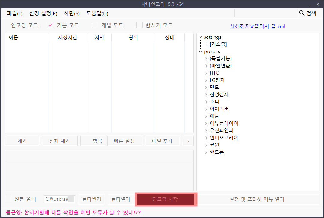 아래와 같이 셋팅 후 설정적용을 눌러 인코딩을 시작합니다.