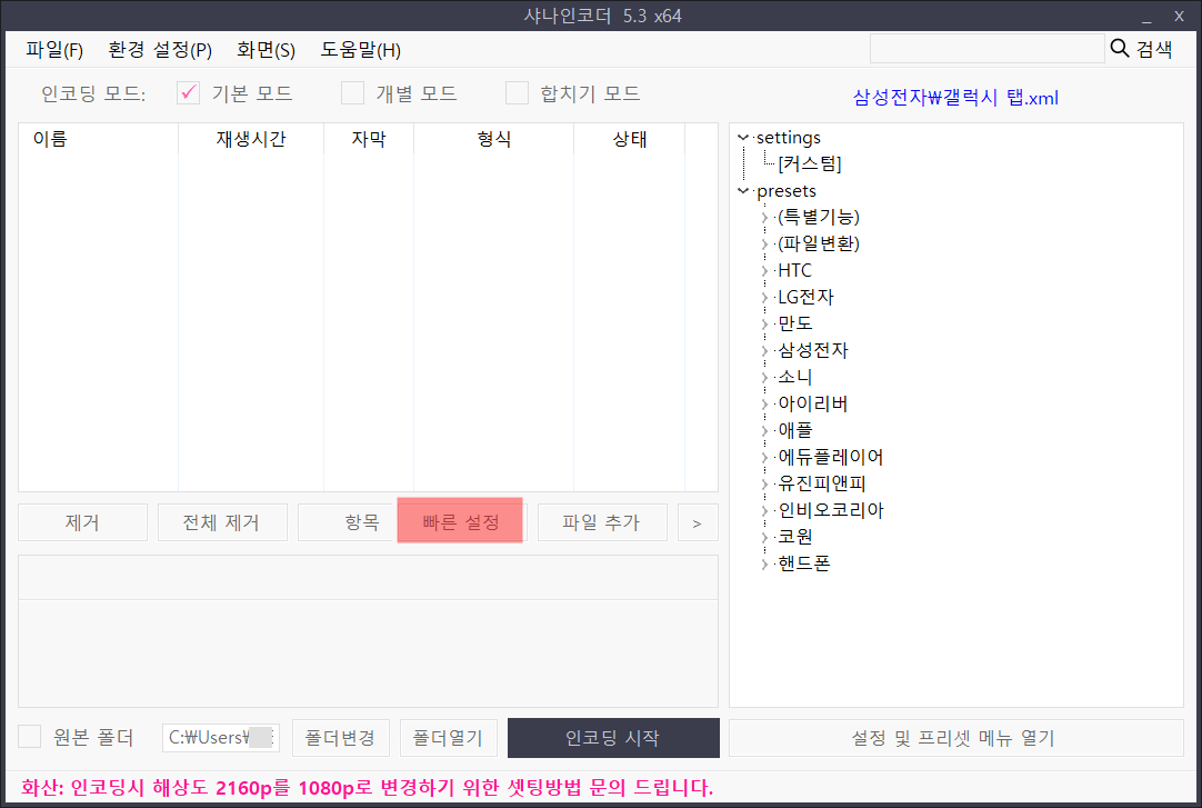 파일을 불러온 후 빠른설정을 클릭합니다.